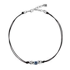 Colgante de cuero con piezas de metal bañadas en plata e incrustación de cristal de SWAROVSKI® ELEMENTS de color azul en el centro. La cadena del cierre permite ajustar la largura del colgante y finaliza con el candado característico de la firma. Una joya elegante y atemporal que refleja el espíritu urbano de UNOde50. Hecho 100 % a mano en España.