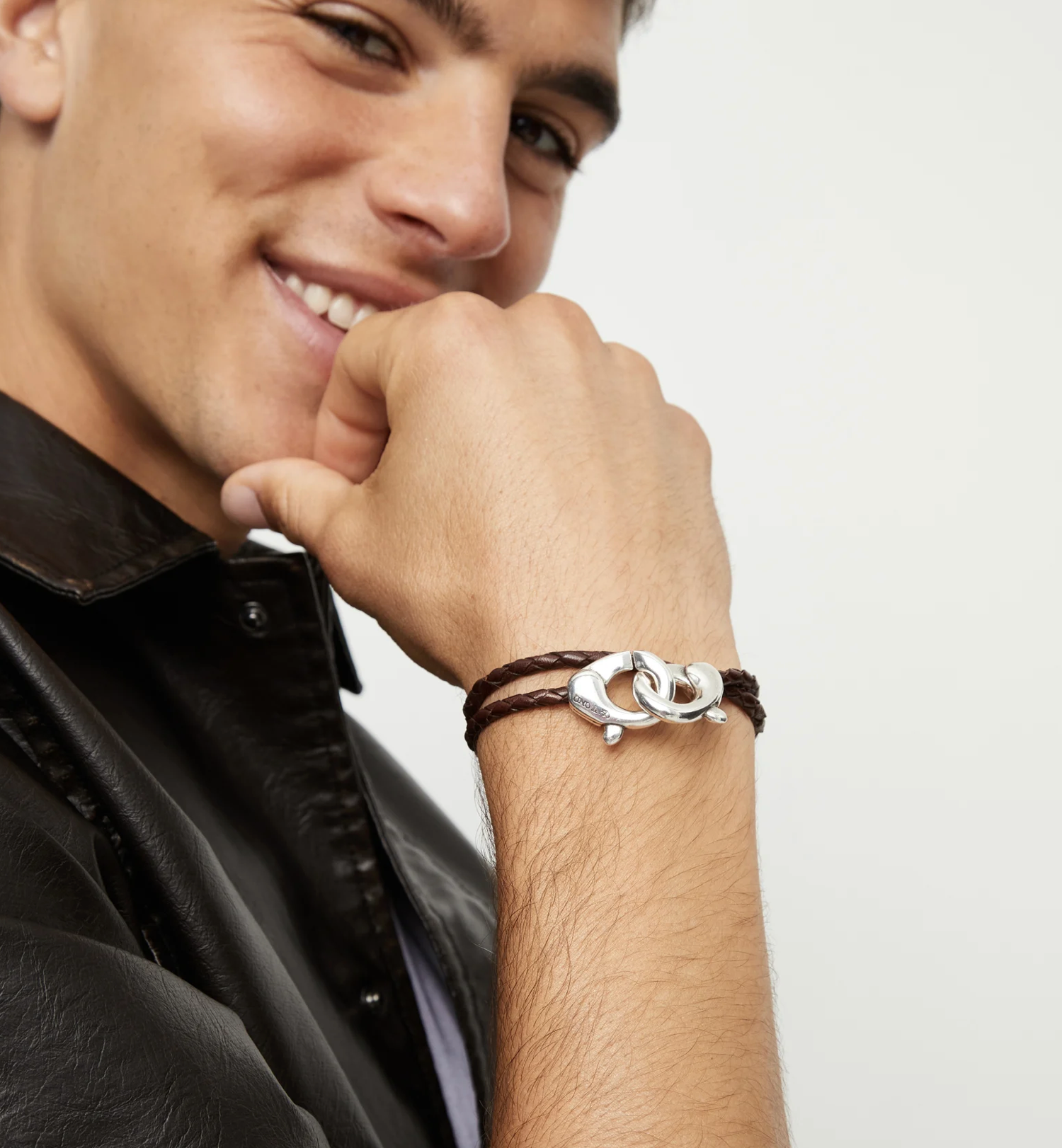 Double brown leather bracelet with interlocking carabiner